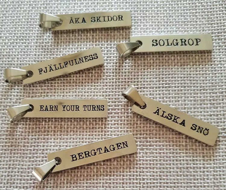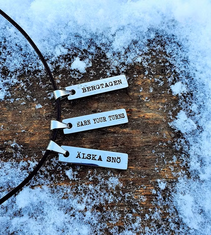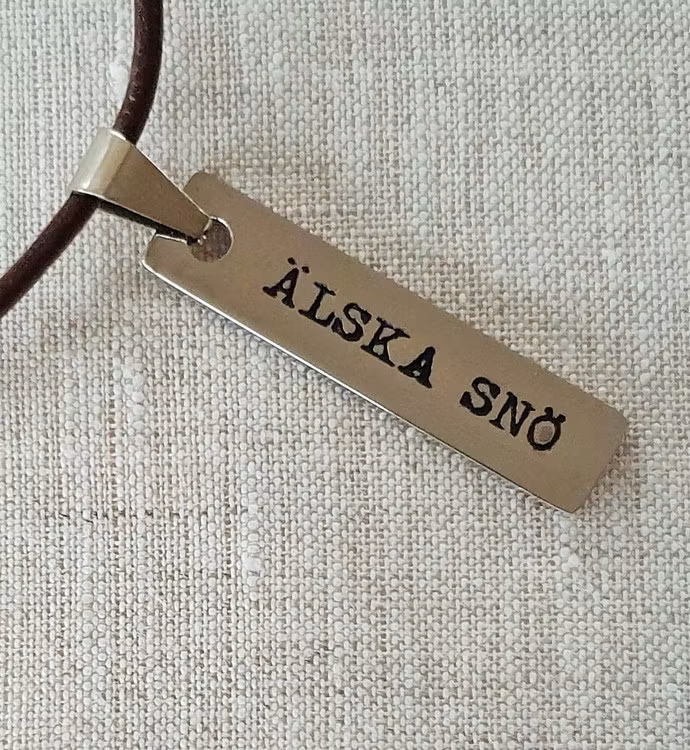 I lager. Antal: 87 Älska Snö berlock med läderband 299 kr Lägg i korgen ÄLSKA SNÖStämplat/graverat på platta av stål.Längd: 3 cm, Bredd: 0,5 cm, tjocklek: 2 mm.Levereras tillsammans med 80 cm brunt lädersnöre (2 mm).