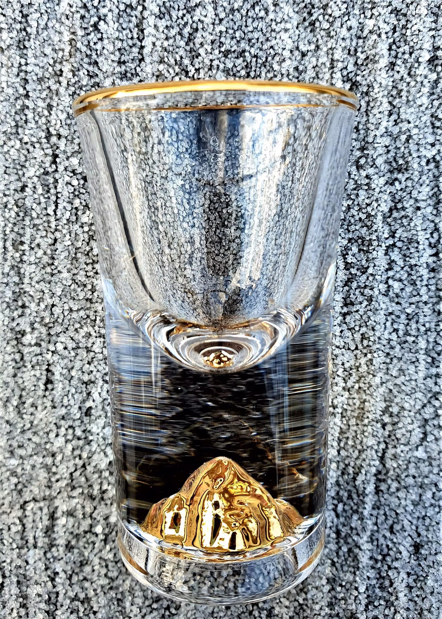 Snaps- eller likörglas med ingjutet gyllene fjäll i botten.
